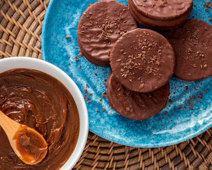 Rellenamos con el dulce de leche entre dos tapas. Derretimos el chocolate en el microondas por intervalos de 30 segundos hasta que quede líquido y pasamos de ambos lados por el chocolate hasta que quede completamente cubierto, con un tenedor sosteniendo la base del alfajor dar golpes secos sobre el borde del bowl para retirar el excedente de baño de chocolate. Colocar sobre una rejilla hasta que el chocolate haya secado.