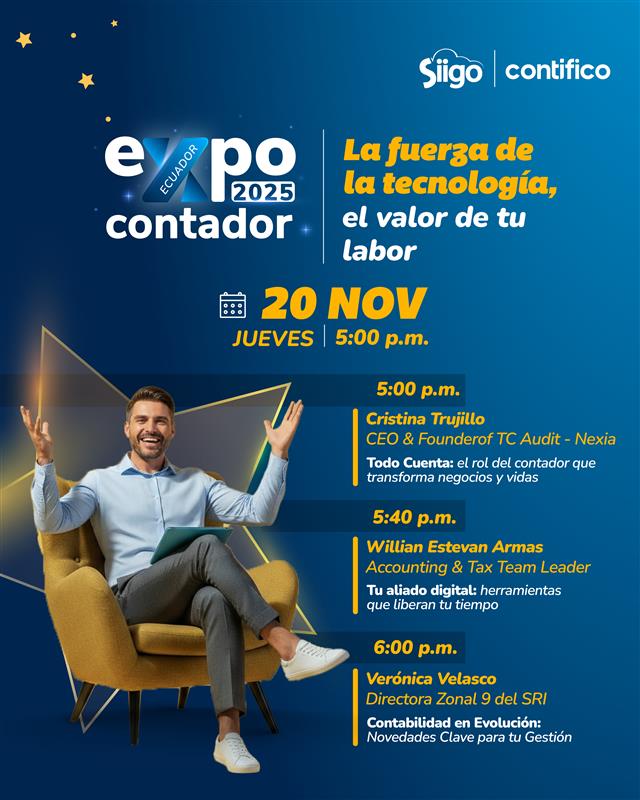 Por ello, Siigo Contífico llevará a cabo la EXPO CONTADOR 2025 el 20 de noviembre a las 17h00, en formato virtual, gratuito y con certificado digital de participación. La jornada reunirá a expertos que abordarán temas como la transformación del rol contable de operativo a estratégico, casos reales de éxito, claves para un cierre eficiente, nuevas tendencias aplicadas a la práctica diaria y el uso de herramientas que impulsan la productividad y el reconocimiento profesional.