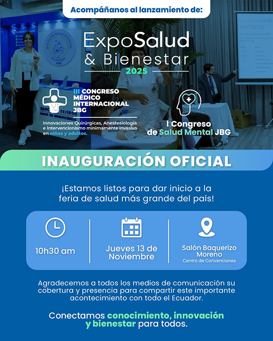 El próximo 13, 14 y 15 de noviembre, el Centro de Convenciones de Guayaquil abrirá sus puertas a uno de los encuentros más esperados del año: el III Congreso Nacional e Internacional, ExpoSalud & Bienestar 2025, organizado por la Junta de Beneficencia (JBG).