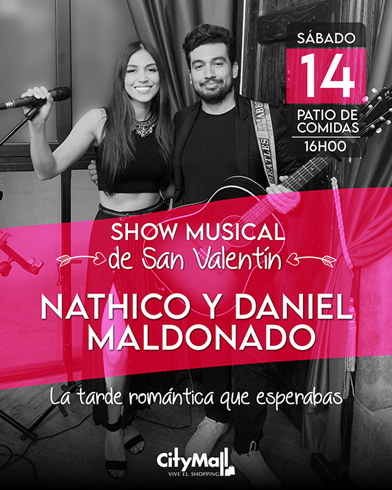 Como parte de las celebraciones programadas para este día, CityMall prepara La tarde romántica interpretada por los artistas Nathico y Daniel Maldonado, quienes serán los encargados de poner sentimiento, ritmo y amor a la jornada. Los detalles del evento son: