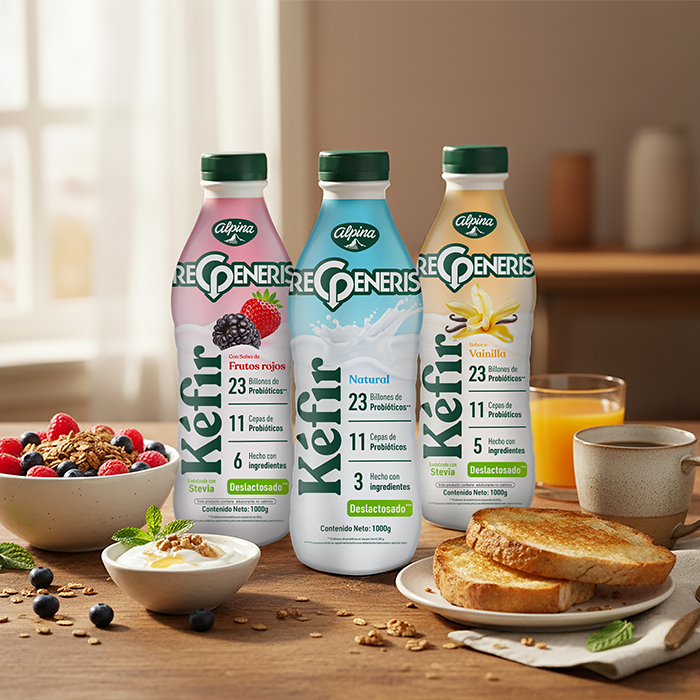 Ante este contexto, Alpina Ecuador presenta Kéfir Regeneris, una bebida probiótica que contiene 23 billones de probióticos por porción y 11 cepas distintas, elaborado con ingredientes completamente naturales, endulzado con 100% Stevia que le da un sabor suave y delicioso. Además, es deslactosado, sin espesantes, conservantes ni colorantes artificiales, y se presenta en tres variedades: natural (3 ingredientes), vainilla y frutos rojos (5 ingredientes). Con estas características, se convierte en el primer producto del mercado ecuatoriano con una concentración y diversidad probiótica de este nivel.