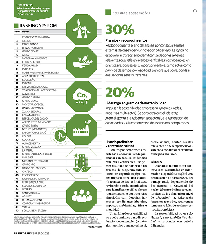 El ranking de las Empresas Más Sostenibles del Ecuador es un ejercicio técnico de evaluación comparativa que busca identificar, con criterios verificables, a las organizaciones que demuestran un desempeño consistente en sostenibilidad y ESG. YPSILOM lo elabora desde el 2020 con el objetivo de distinguir avances reales en gestión, liderazgo sectorial y resultados reconocidos públicamente.