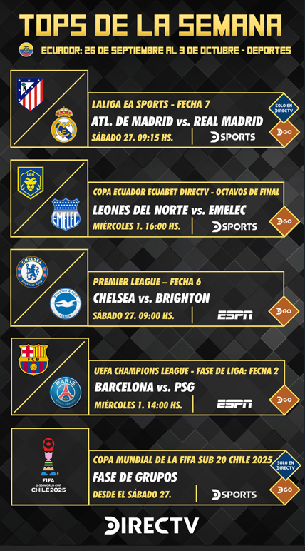 - 26/9. 19:00. Copa Ecuador DIRECTV – Octavos de Final. Cuanca Jrs vs. La Cantera por DSPORTS 610/1610 HD y DGO