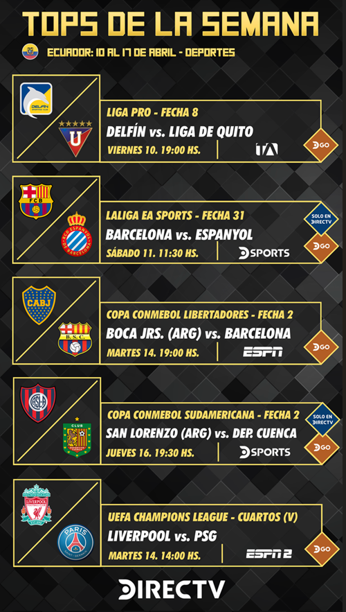 Programación deportiva DIRECTV Ecuador – Desde el 10 hasta el 17 de abril