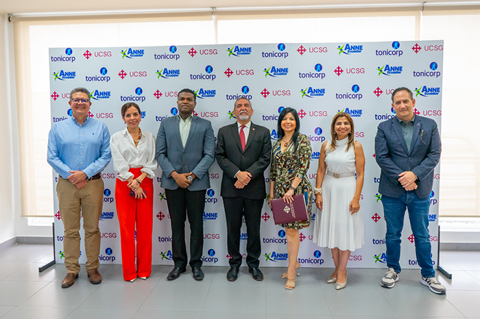 De izquierda a derecha:  Fernando Gómes, director de Finanzas de Tonicorp; Sofía Sierra, gerente de Sostenibilidad y Comunicación Arca Continental; Vladimir Maffare, presidente de la ANNE; José Luis Jouvin, decano de la Facultad de Ciencias de la Salud; Martha Celi, directora de la Carrera de Nutrición; Alexandra Bajaña, directora de Vinculación de la Carrera de Nutrición de la UCSG; y, Alfredo Rodríguez, director de Marketing y Estrategia Comercial de Tonicorp.