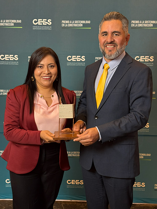 - Reconocimiento por su contribución al desarrollo sostenible en la construcción, mediante la elaboración de las primeras cuatro Fichas de Aporte de Materiales LEED en Ecuador.